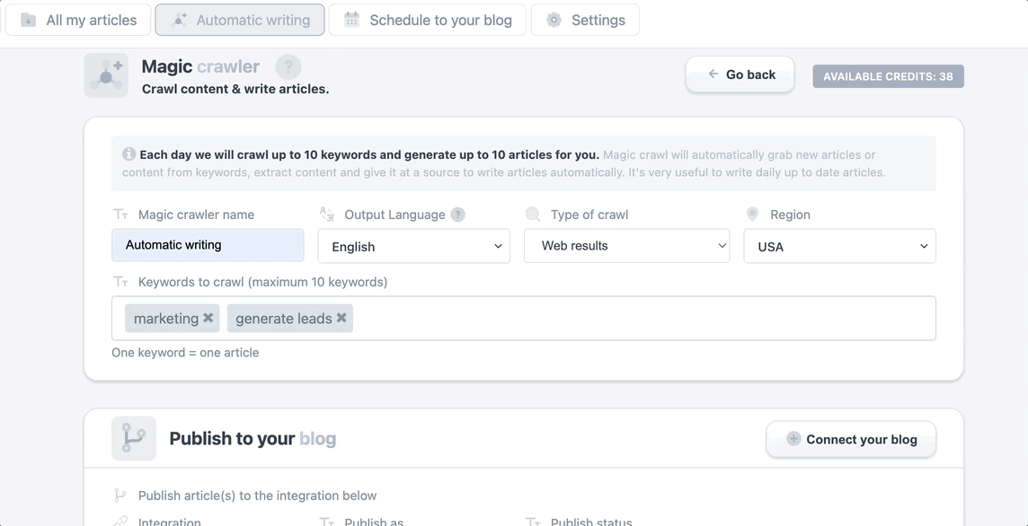 Generate more blog content in less time.- Produce multiple articles in bulk